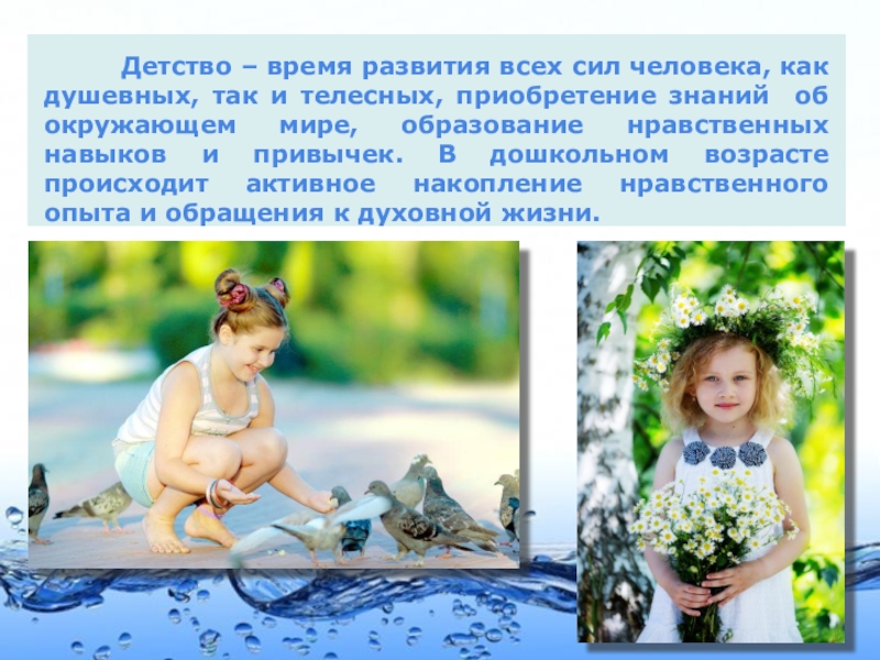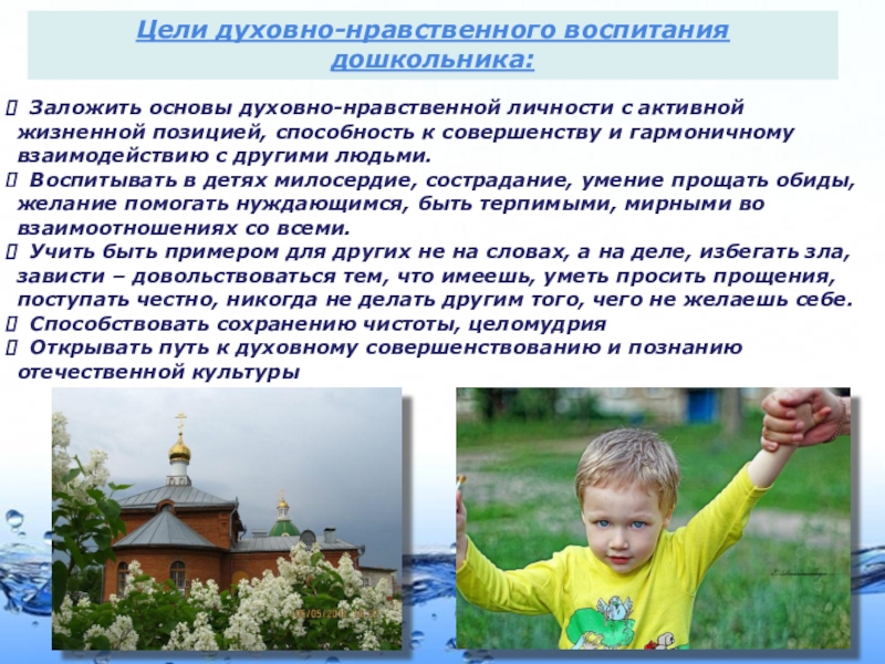 человека, как душевных, так и телесных, приобретение знаний об окружающем мире, образование нравственных навыков и привычек. В дошкольном возрасте происходит активное накопление нравственного опыта и обращения к духовной жизни.