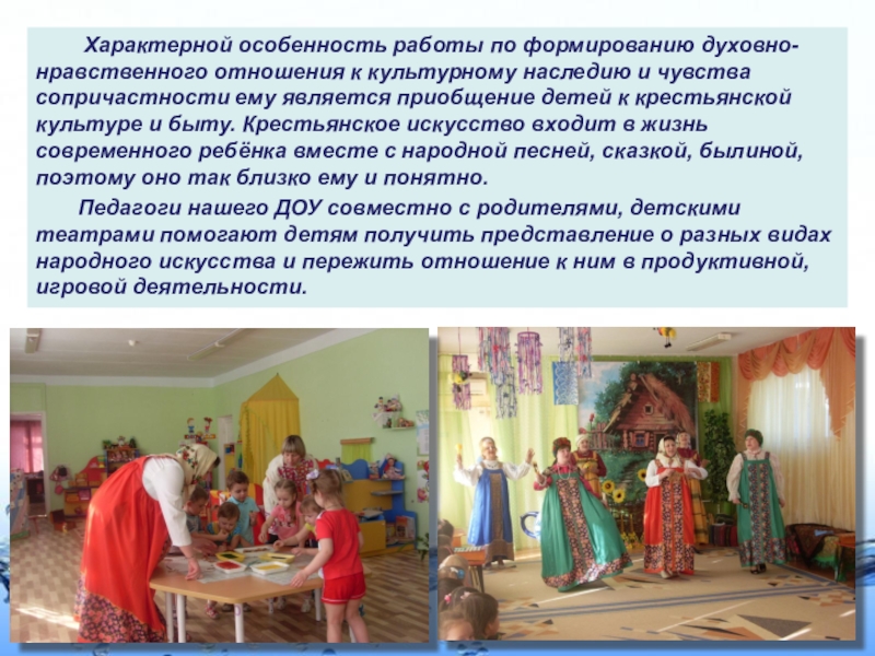 к культурному наследию и чувства сопричастности ему является приобщение детей к крестьянской культуре и быту. Крестьянское искусство входит в жизнь современного ребёнка вместе с народной песней, сказкой, былиной, поэтому оно так близко ему и понятно.