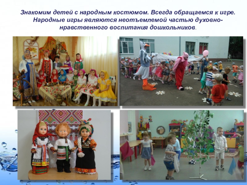 Слайд 10Знакомим детей с народным костюмом. Всегда обращаемся к игре. Народные игры