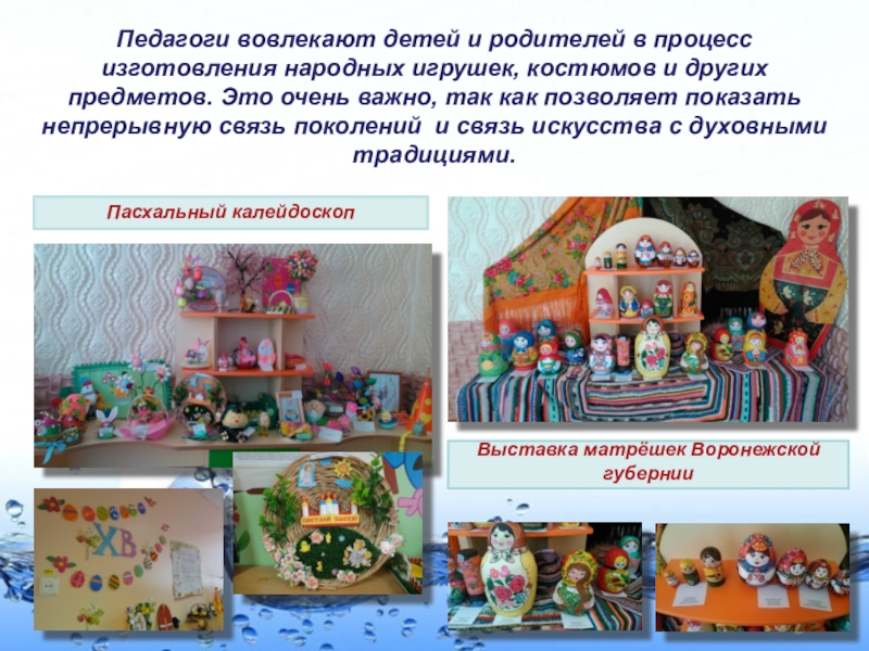 народных игрушек, костюмов и других предметов. Это очень важно, так как позволяет показать непрерывную связь поколений и связь искусства с духовными традициями.