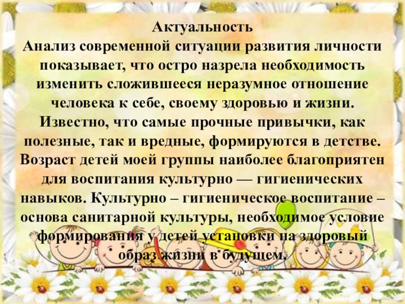 сложившееся неразумное отношение человека к себе, своему здоровью и жизни. Известно, что самые прочные привычки, как полезные, так и вредные, формируются в детстве. Возраст детей моей группы наиболее благоприятен для воспитания культурно — гигиенических навыков. Культурно – гигиеническое воспитание – основа санитарной культуры, необходимое условие формирования у детей установки на здоровый образ жизни в будущем.