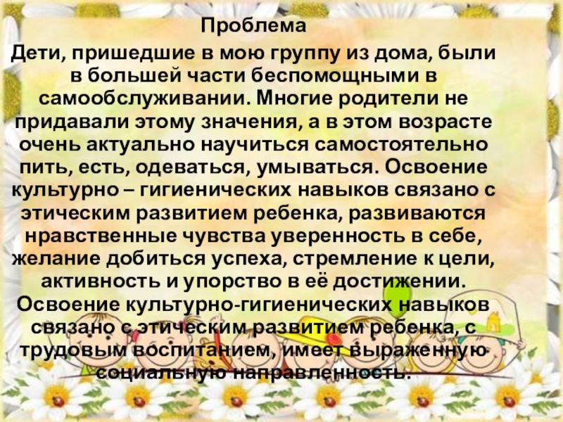 беспомощными в самообслуживании. Многие родители не придавали этому значения, а в этом возрасте очень актуально научиться самостоятельно пить, есть, одеваться, умываться. Освоение культурно – гигиенических навыков связано с этическим развитием ребенка, развиваются нравственные чувства уверенность в себе, желание добиться успеха, стремление к цели, активность и упорство в её достижении. Освоение культурно-гигиенических навыков связано с этическим развитием ребенка, с трудовым воспитанием, имеет выраженную социальную направленность.
