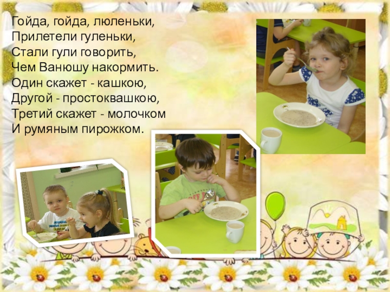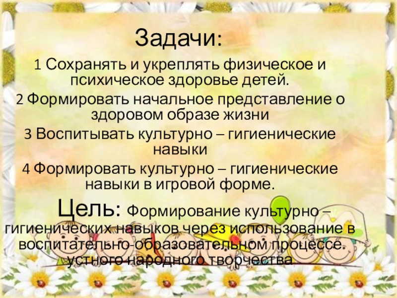 Цель: Формирование культурно –гигиенических навыков через использование в воспитательно-образовательном процессе устного народного творчества