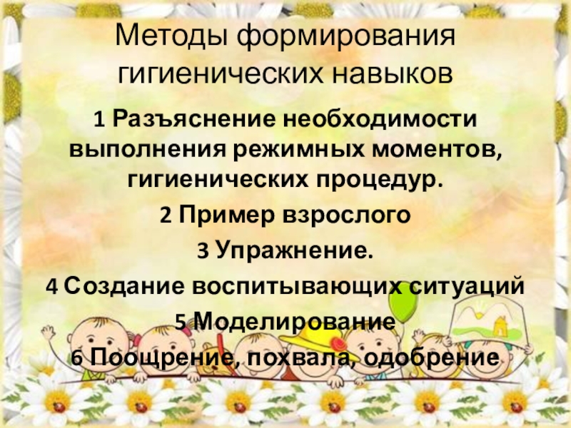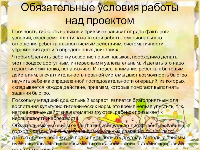 Поскольку младший дошкольный возраст является благоприятным для воспитания культурно-гигиенических норм, это время нельзя упустить, т. к. неправильные действия автоматизируются, ребенок привыкает к неряшливости, небрежности.