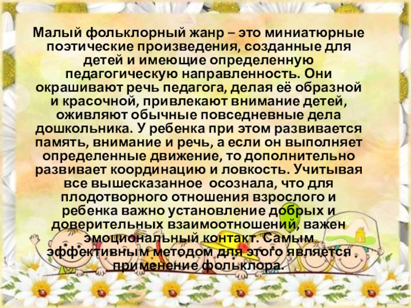 и имеющие определенную педагогическую направленность. Они окрашивают речь педагога, делая её образной и красочной, привлекают внимание детей, оживляют обычные повседневные дела дошкольника. У ребенка при этом развивается память, внимание и речь, а если он выполняет определенные движение, то дополнительно развивает координацию и ловкость. Учитывая все вышесказанное осознала, что для плодотворного отношения взрослого и ребенка важно установление добрых и доверительных взаимоотношений, важен эмоциональный контакт. Самым эффективным методом для этого является применение фольклора.