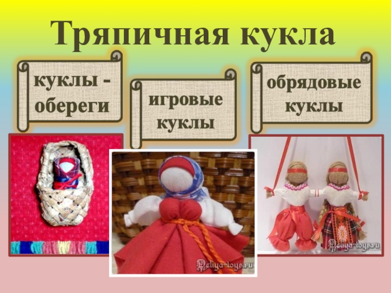 совсем не похожи на современных и создавались не столько для игры, сколько для различных ритуалов. Делали их из любого подручного материала: глины, костей животных, деревянных чурок, соломы, камней, даже из углей. Позже появились тряпичные куклы. Славянские куклы выполняли функцию оберега или помощника в различных делах. Тряпичные куклы-обереги безликие–без глазок, носиков. При их изготовлении, как правило, не используют ножницы, а ткани просто рвут.