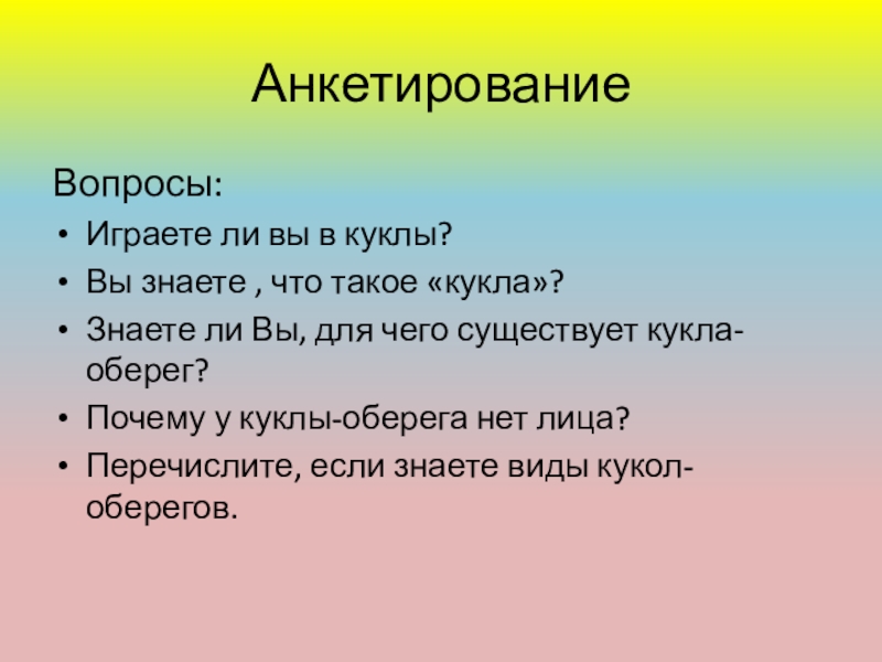 АнкетированиеВопросы:	Играете ли вы в куклы?			Вы знаете , что такое «кукла»?			Знаете ли Вы, для чего существует кукла-оберег?			Почему у