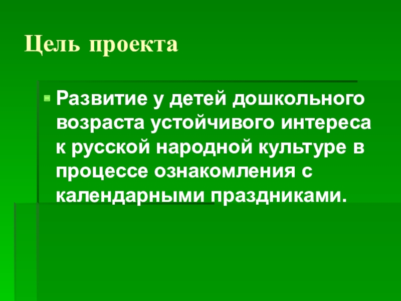 Детство – то время, когда возможно подлинное, искреннее погружение в истоки национальной культуры, к русским корням. Во время чтения детям сказок, заучивания потешек и прибауток заметила как начинают блестеть от радости глаза детей, в душе загораться интерес к русскому народному творчеству. Тогда-то и появилось желание познакомить детей с русской народной культурой в комплексе всех ее видов (устное народное творчество, музыкальный фольклор, декоративно-прикладное искусство) для большего усиления чувственно-эмоциональной окраски. Этой цели в большей мере соответствуют народные праздники и обряды. Ведь именно в них фиксируется накопленные веками наблюдения за характерными особенностями времён года, связанные с трудом и бытом человека во всей их целостности и многообразии. В праздничных обрядах, ритуалах закрепляется социальное поведение, помогающее ребёнку осознать свою национальную принадлежность, а яркая эмоциональная форма и содержание воспитывают положительные чувства. В праздниках соединяются разные виды народного искусства. Ведь невозможно представить себе народный обряд без национальной одежды, музыки, предметов крестьянской жизни. В обряде все это соединяется.