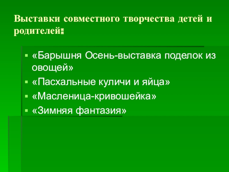 Слайд 12Выставки совместного творчества детей и родителей: