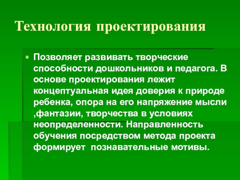 проектирования лежит концептуальная идея доверия к природе ребенка, опора на его напряжение мысли ,фантазии, творчества в условиях неопределенности. Направленность обучения посредством метода проекта формирует познавательные мотивы.