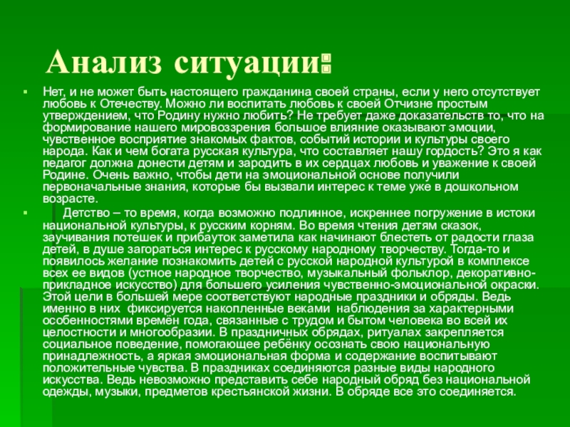 если у него отсутствует любовь к Отечеству. Можно ли воспитать любовь к своей Отчизне простым утверждением, что Родину нужно любить? Не требует даже доказательств то, что на формирование нашего мировоззрения большое влияние оказывают эмоции, чувственное восприятие знакомых фактов, событий истории и культуры своего народа. Как и чем богата русская культура, что составляет нашу гордость? Это я как педагог должна донести детям и зародить в их сердцах любовь и уважение к своей Родине. Очень важно, чтобы дети на эмоциональной основе получили первоначальные знания, которые бы вызвали интерес к теме уже в дошкольном возрасте.
