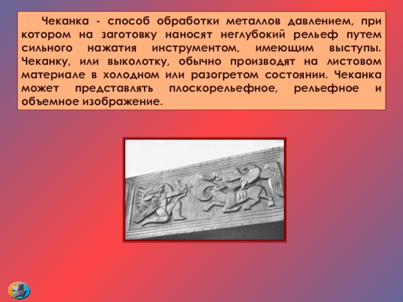 Слайд 85 Чеканка - способ обработки металлов давлением, при котором на заготовку наносят