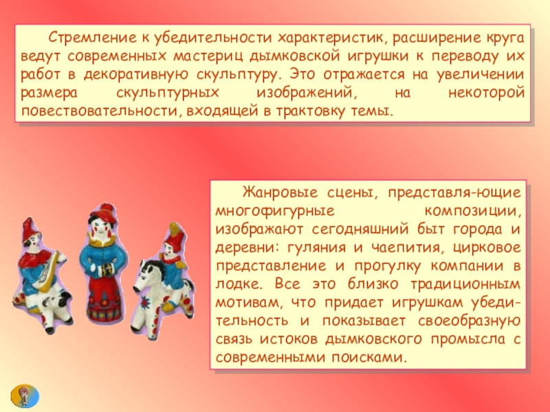 Слайд 14 Стремление к убедительности характеристик, расширение круга ведут современных мастериц дымковской игрушки