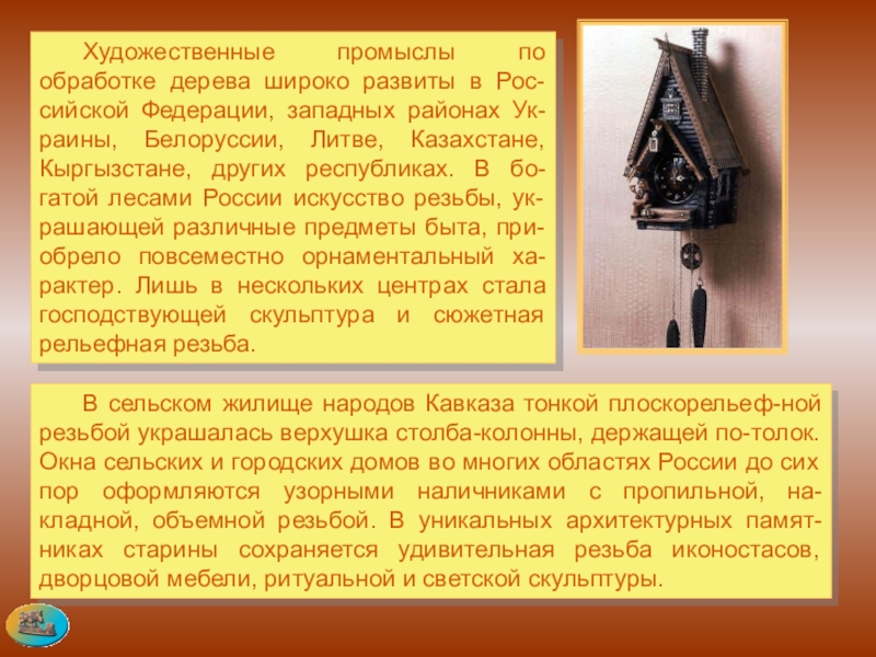 районах Ук-раины, Белоруссии, Литве, Казахстане, Кыргызстане, других республиках. В бо-гатой лесами России искусство резьбы, ук-рашающей различные предметы быта, при-обрело повсеместно орнаментальный ха-рактер. Лишь в нескольких центрах стала господствующей скульптура и сюжетная рельефная резьба.
