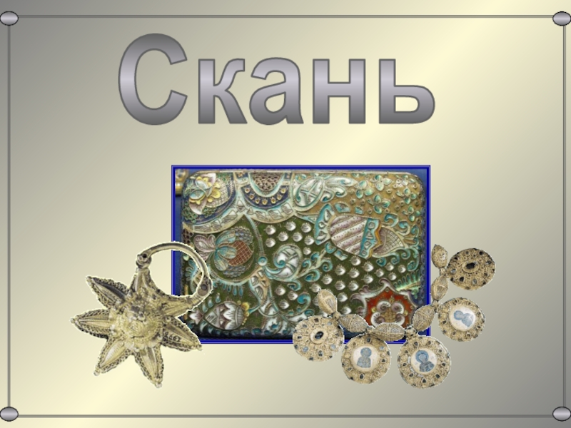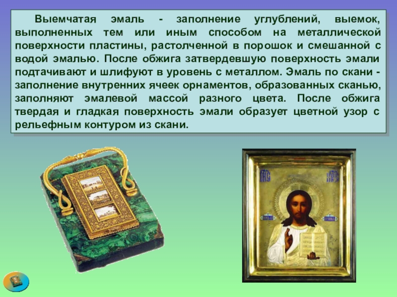 на металлической поверхности пластины, растолченной в порошок и смешанной с водой эмалью. После обжига затвердевшую поверхность эмали подтачивают и шлифуют в уровень с металлом. Эмаль по скани - заполнение внутренних ячеек орнаментов, образованных сканью, заполняют эмалевой массой разного цвета. После обжига твердая и гладкая поверхность эмали образует цветной узор с рельефным контуром из скани.