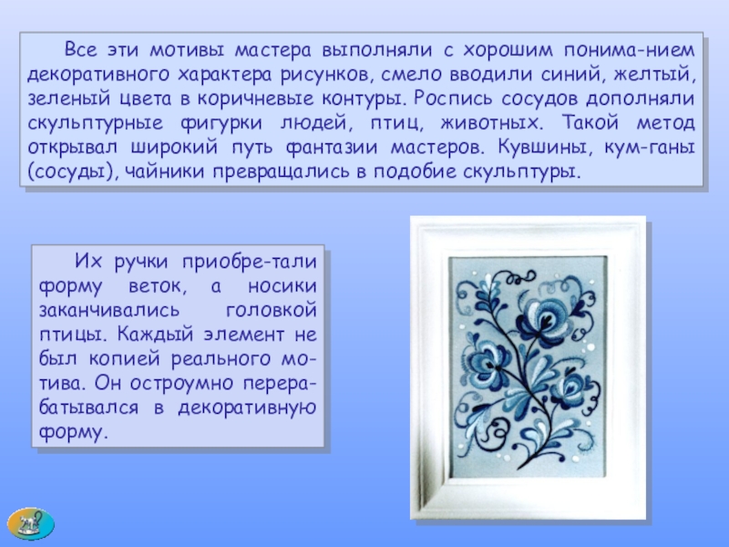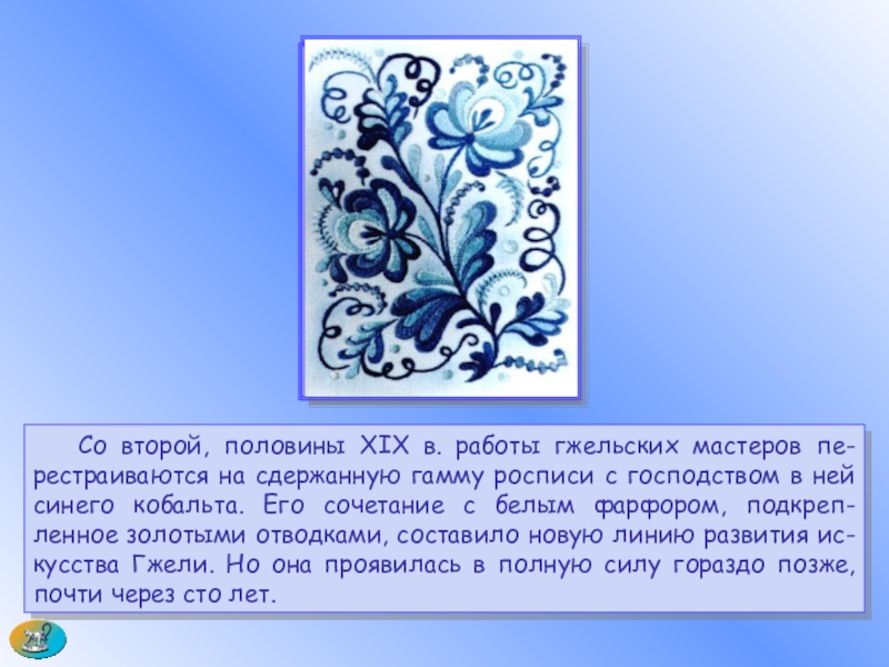 Слайд 40 Со второй, половины XIX в. работы гжельских мастеров пе-рестраиваются на сдержанную