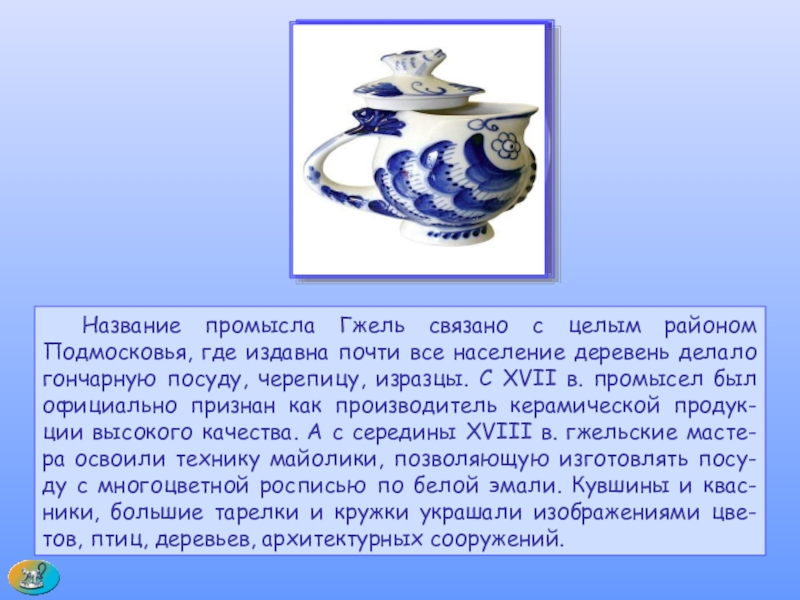 все население деревень делало гончарную посуду, черепицу, изразцы. С XVII в. промысел был официально признан как производитель керамической продук-ции высокого качества. А с середины XVIII в. гжельские масте-ра освоили технику майолики, позволяющую изготовлять посу-ду с многоцветной росписью по белой эмали. Кувшины и квас-ники, большие тарелки и кружки украшали изображениями цве-тов, птиц, деревьев, архитектурных сооружений.