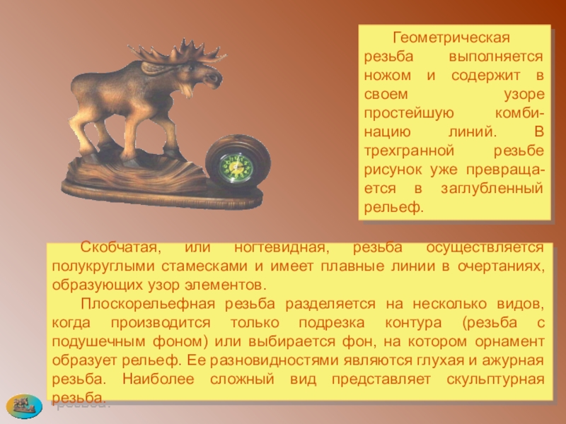 Геометрическая резьба выполняется ножом и содержит в своем узоре простейшую комби-нацию линий. В трехгранной резьбе рисунок уже превраща-ется в заглубленный рельеф.