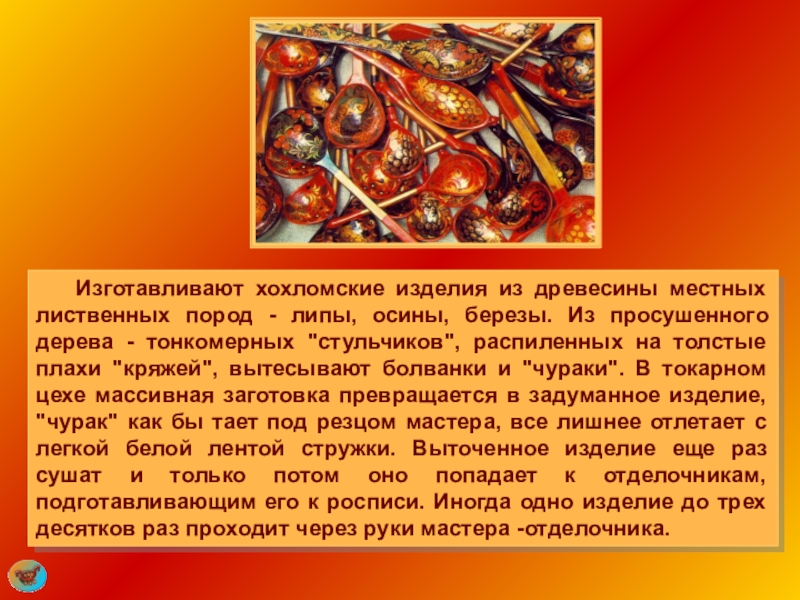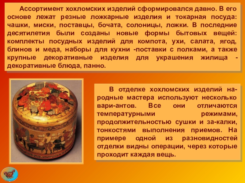 Слайд 46 Ассортимент хохломских изделий сформировался давно. В его основе лежат резные ложкарные