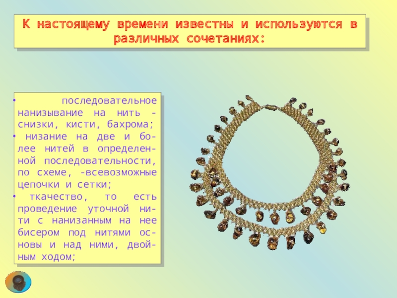 Слайд 61 последовательное нанизывание на нить - снизки, кисти, бахрома;