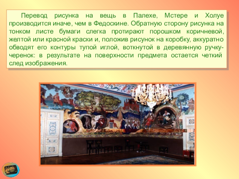Слайд 25 Перевод рисунка на вещь в Палехе, Мстере и Холуе производится иначе,