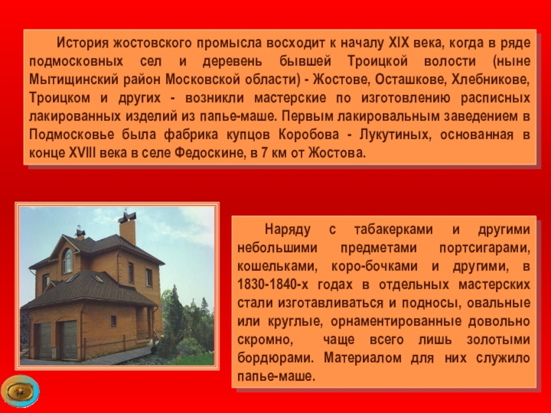 подмосковных сел и деревень бывшей Троицкой волости (ныне Мытищинский район Московской области) - Жостове, Осташкове, Хлебникове, Троицком и других - возникли мастерские по изготовлению расписных лакированных изделий из папье-маше. Первым лакировальным заведением в Подмосковье была фабрика купцов Коробова - Лукутиных, основанная в конце XVIII века в селе Федоскине, в 7 км от Жостова.