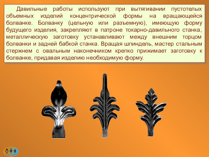 Слайд 98 Давильные работы используют при вытягивании пустотелых объемных изделий концентрической формы на