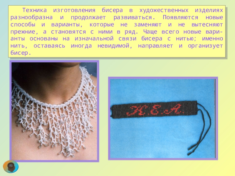 Слайд 60 Техника изготовления бисера в художественных изделиях разнообразна и продолжает развиваться. Появляются