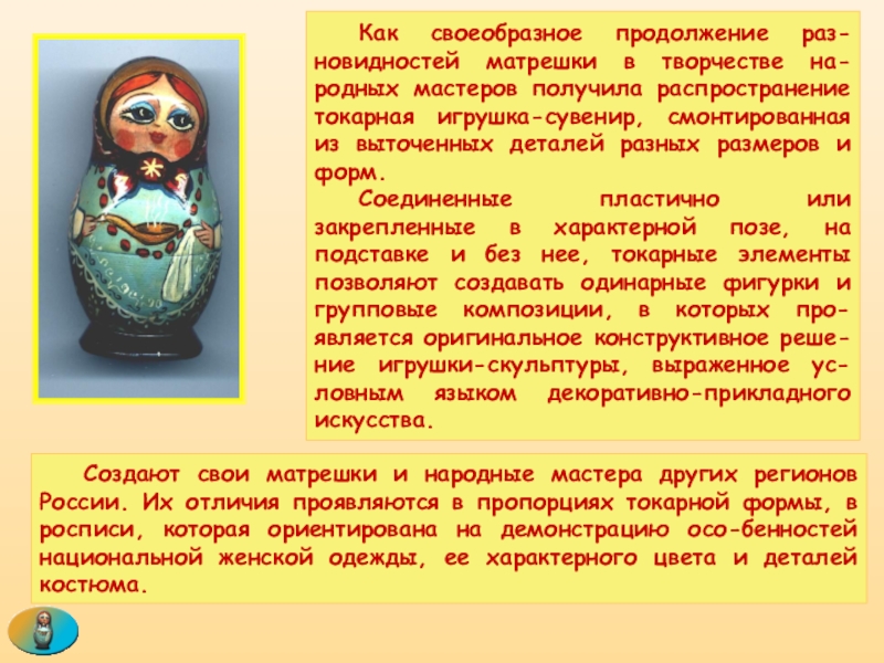 Как своеобразное продолжение раз-новидностей матрешки в творчестве на-родных мастеров получила распространение токарная игрушка-сувенир, смонтированная из выточенных деталей разных размеров и форм.