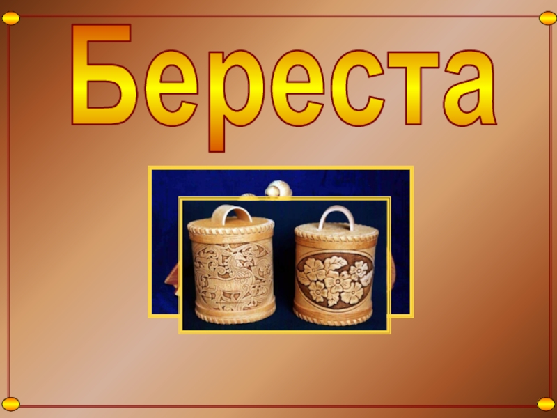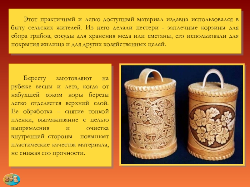 Слайд 32 Круг предметов, выполняемых из бересты, неширок - чаще всего это туеса,