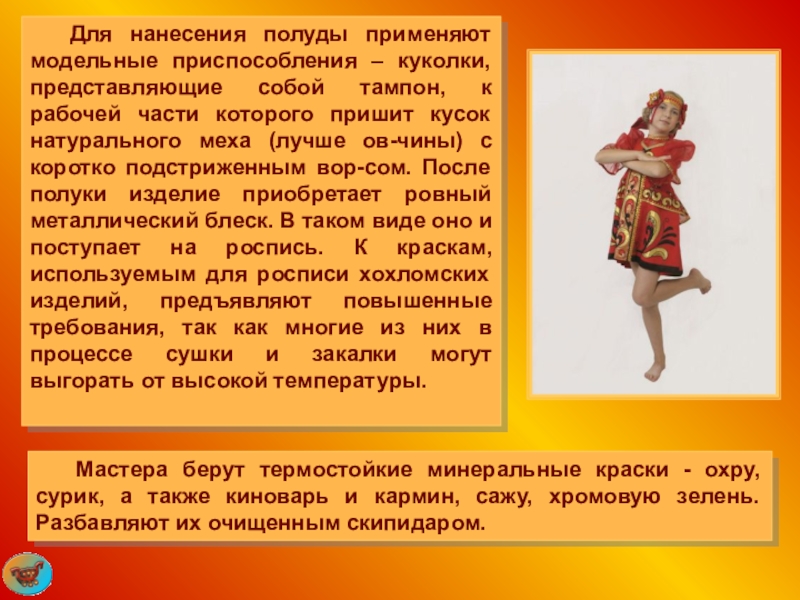 Для нанесения полуды применяют модельные приспособления – куколки, представляющие собой тампон, к рабочей части которого пришит кусок натурального меха (лучше ов-чины) с коротко подстриженным вор-сом. После полуки изделие приобретает ровный металлический блеск. В таком виде оно и поступает на роспись. К краскам, используемым для росписи хохломских изделий, предъявляют повышенные требования, так как многие из них в процессе сушки и закалки могут выгорать от высокой температуры.