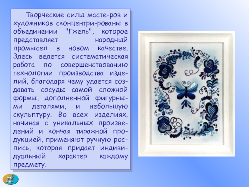 Слайд 41 Творческие силы масте-ров и художников сконцентри-рованы в объединении "Гжель", которое представляет