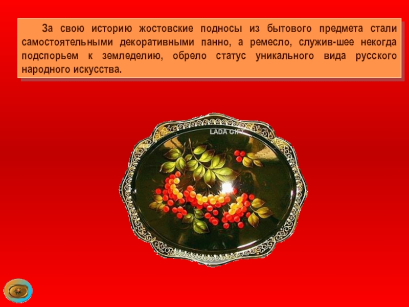 Слайд 68 За свою историю жостовские подносы из бытового предмета стали самостоятельными декоративными
