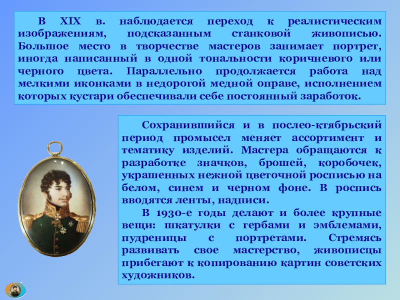 Слайд 22 Мастера палехского промысла, сохранив самобыт-ную и традиционную технику живописи, заимствовали у