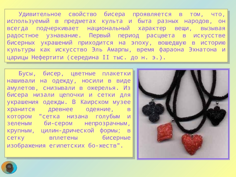 Бусы, бисер, цветные плакетки нашивали на одежду, носили в виде амулетов, снизывали в ожерелья. Из бисера низали цепочки и сетки для украшения одежды. В Каирском музее хранится древнее одеяние, в котором "сетка низана голубым и зеленым би-сером непрозрачным, крупным, цилин-дрической формы; в сетку вплетены бисерные изображения египетских бо-жеств".
