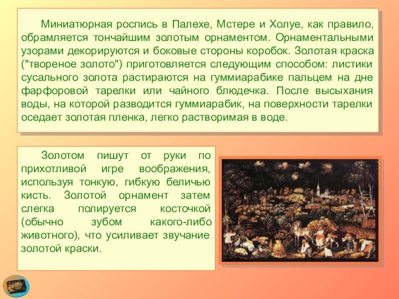 Слайд 29 Миниатюрная роспись в Палехе, Мстере и Холуе, как правило, обрамляется тончайшим