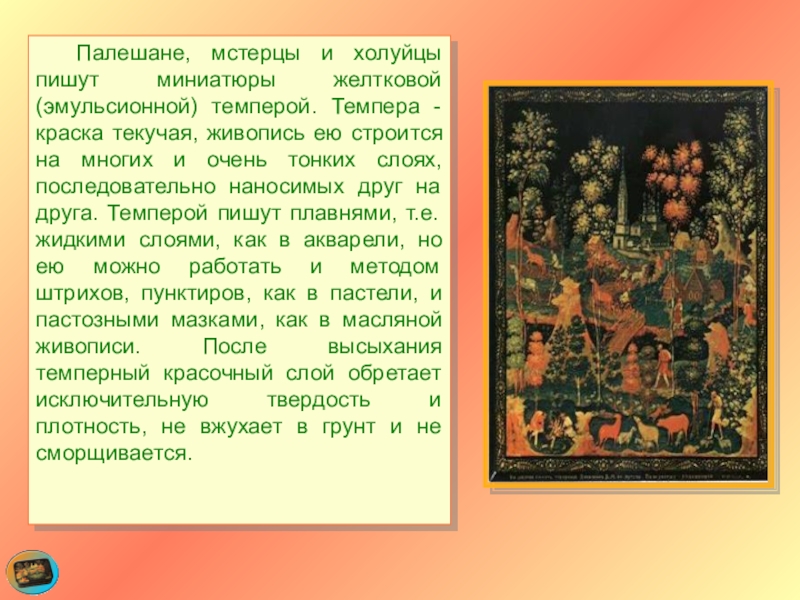 Слайд 23 Палешане, мстерцы и холуйцы пишут миниатюры желтковой (эмульсионной) темперой. Темпера -