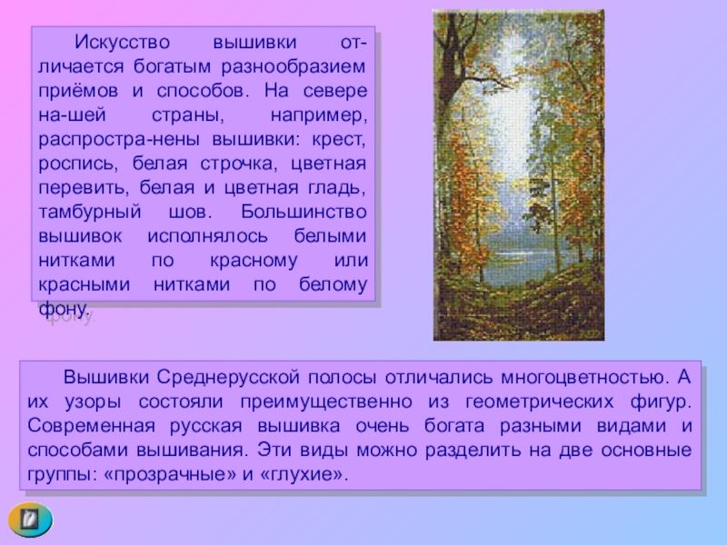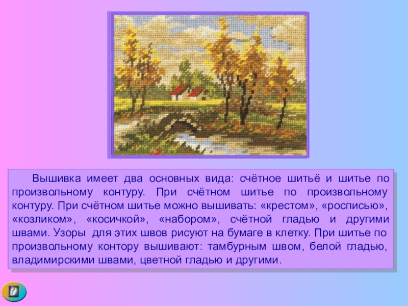 Слайд 7 Вышивка имеет два основных вида: счётное шитьё и шитье по произвольному