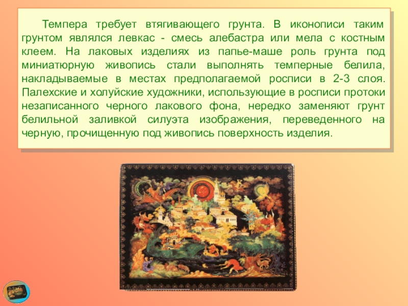 Слайд 24 Темпера требует втягивающего грунта. В иконописи таким грунтом являлся левкас -