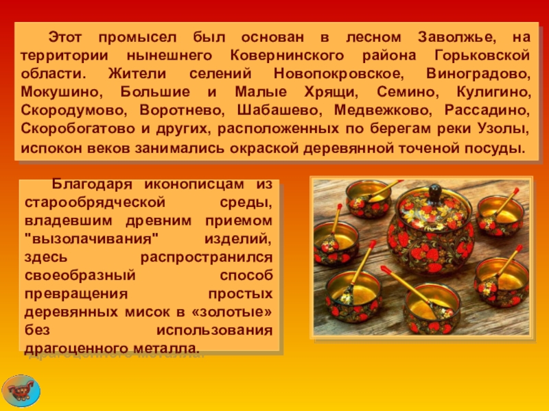Слайд 44 Этот промысел был основан в лесном Заволжье, на территории нынешнего Ковернинского