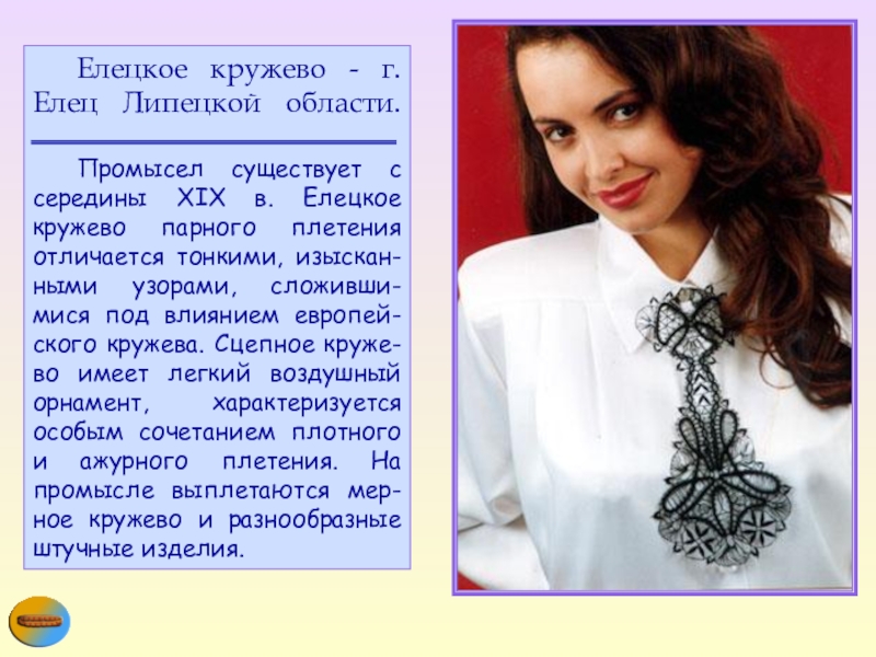 в. Елецкое кружево парного плетения отличается тонкими, изыскан-ными узорами, сложивши-мися под влиянием европей-ского кружева. Сцепное круже-во имеет легкий воздушный орнамент, характеризуется особым сочетанием плотного и ажурного плетения. На промысле выплетаются мер-ное кружево и разнообразные штучные изделия.