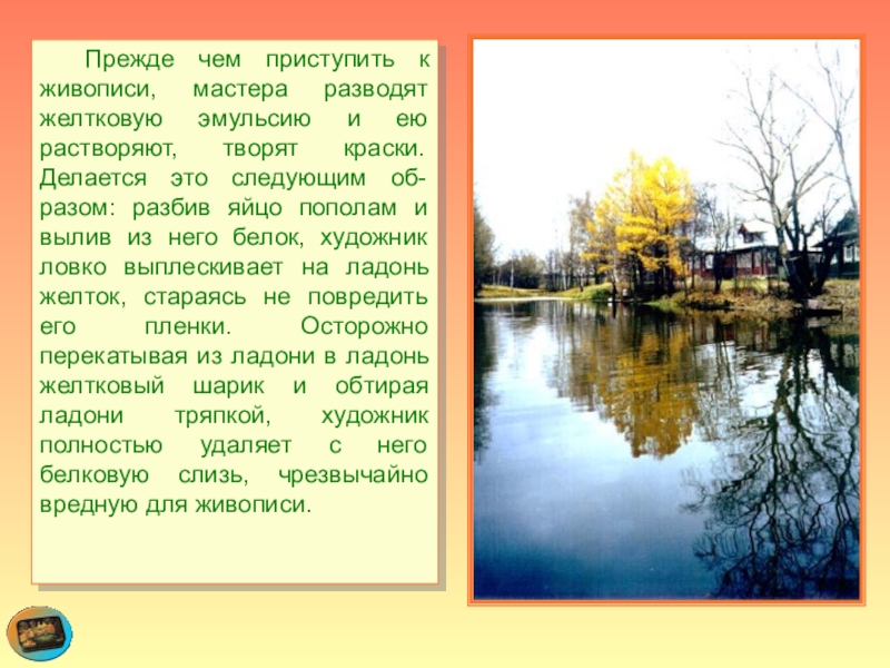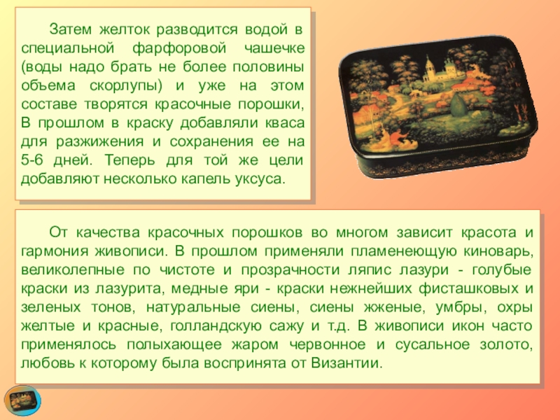 Слайд 26 Прежде чем приступить к живописи, мастера разводят желтковую эмульсию и ею