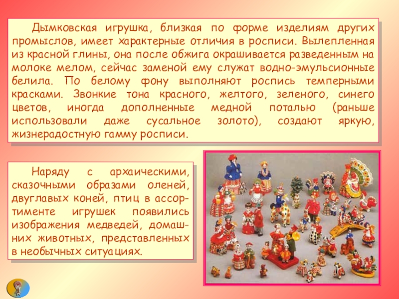 в росписи. Вылепленная из красной глины, она после обжига окрашивается разведенным на молоке мелом, сейчас заменой ему служат водно-эмульсионные белила. По белому фону выполняют роспись темперными красками. Звонкие тона красного, желтого, зеленого, синего цветов, иногда дополненные медной поталью (раньше использовали даже сусальное золото), создают яркую, жизнерадостную гамму росписи.