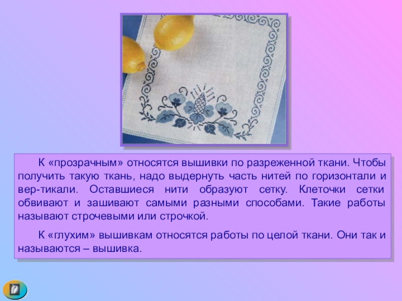 Слайд 6 К «прозрачным» относятся вышивки по разреженной ткани. Чтобы получить такую ткань,