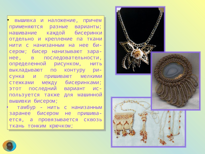 Слайд 62 вышивка и наложение, причем применяются разные варианты; нашивание каждой бисеринки