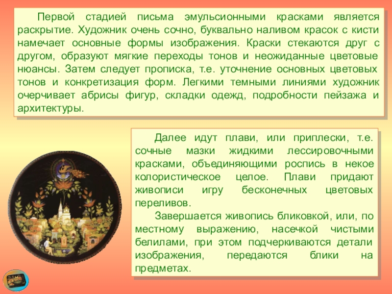 Слайд 28 Первой стадией письма эмульсионными красками является раскрытие. Художник очень сочно, буквально