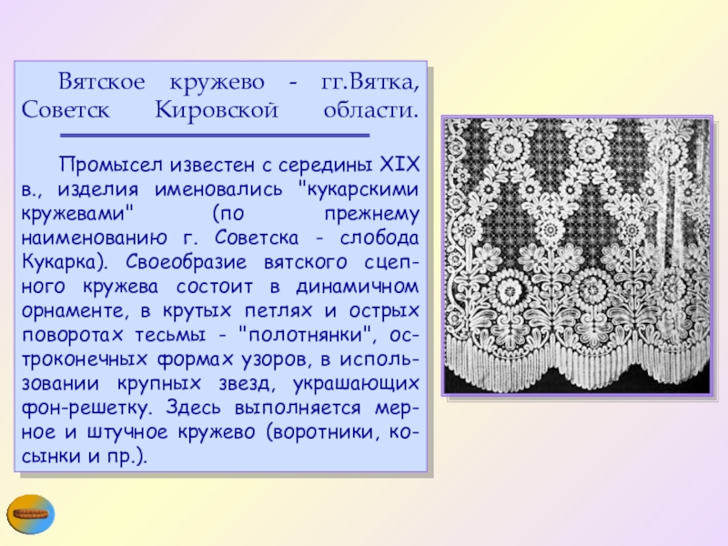 Слайд 18 Вятское кружево - гг.Вятка, Советск Кировской области.