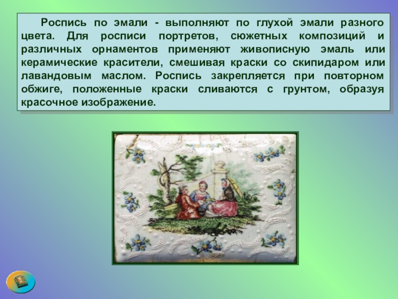 Слайд 93 Роспись по эмали - выполняют по глухой эмали разного цвета. Для