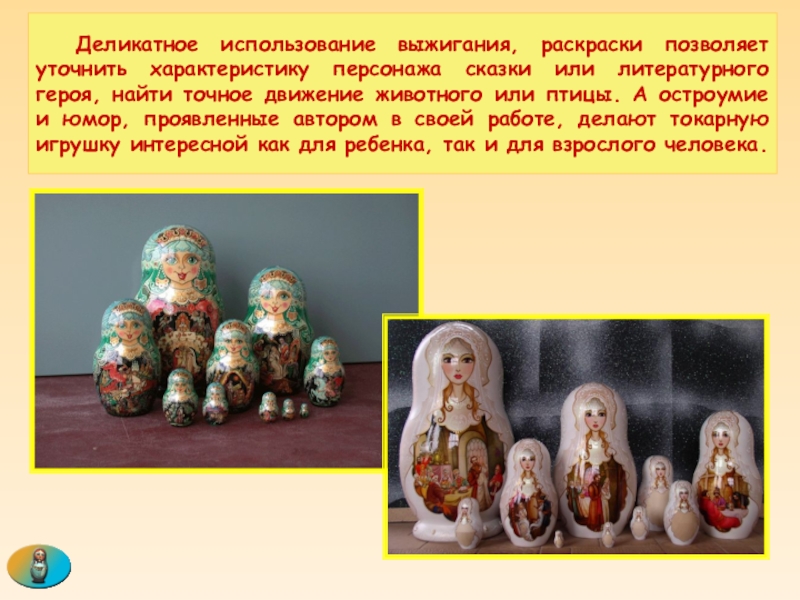 Слайд 72 Деликатное использование выжигания, раскраски позволяет уточнить характеристику персонажа сказки или литературного