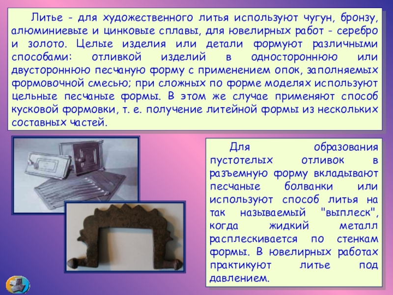 Слайд 95 Литье - для художественного литья используют чугун, бронзу, алюминиевые и цинковые